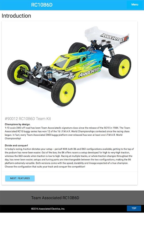 You'll have plenty of resources at hand if you need to fix the buggy, tune it, or understand how things work. You'll be able to show it to friends who want to know more about the B6D. To view RC10B6D Essentials, you won't need a network or wi-fi connection -- the content is all onboard. With a network or wi-fi connection, links to see extra information will take you out of the app to view pages on the Team Associated website.