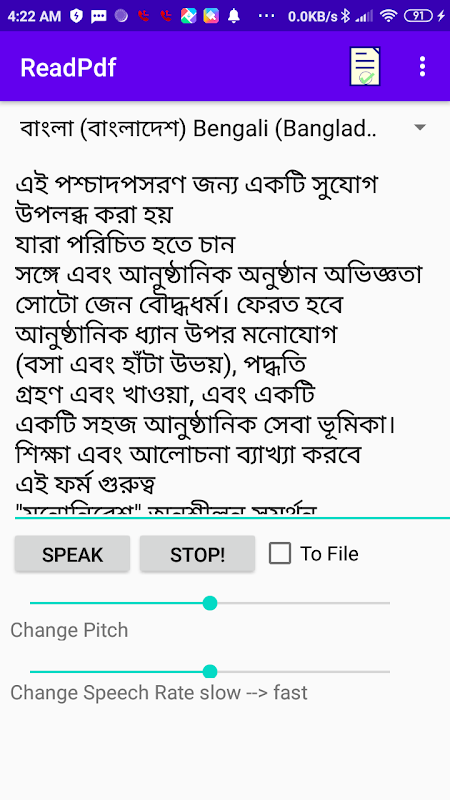 ریڈ پی ڈی ایف ایک ٹیکسٹ ٹو وائس کنورٹر ایپ ہے جو آپ کے آلے کی کسی بھی ٹیکسٹ فائل کو بلند آواز میں پڑھے گی۔ یہ پی ڈی ایف فائل سے بلٹ ان ٹیکسٹریکٹر کی مدد سے پڑھ سکتا ہے۔ ٹائپ کرنے کی ضرورت نہیں ہے۔ اپنے آلے پر اونچی آواز میں ٹیکسٹ یا پی ڈی ایف فائل پڑھیں۔ فائل سلیکٹر آپ کو پڑھنے کے لئے فائل کو منتخب کرنے کے قابل بناتا ہے۔