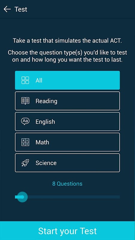 Our Smart Guide helps you learn the critical concepts tested on the ACT with detailed flashcards and practice questions. As you practice ACT questions on Ready4 ACT, the app tracks your performance and highlights your test strengths and weaknesses, helping you zero in on what you need to study in order to boost your ACT score. As you work through your course, you’ll develop your Reading Comprehension abilities, improve your speed on Math questions, learn to spot grammar errors on English questions, and draw inferences on Science questions.