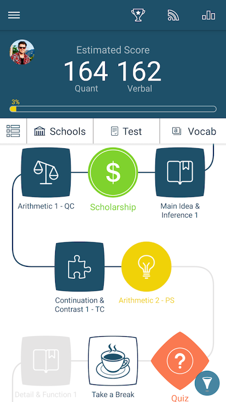 → Expert-designed lessons with text and audio on every adaptive section of the GRE: Problem Solving, Quantitative Comparison, Data Interpretation, Sentence Equivalence, and Text Completion