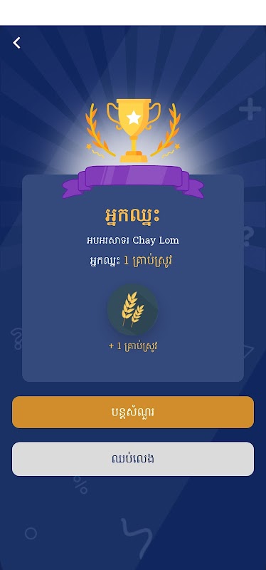 کمبوڈینوں کو چاول عطیہ کرنے کے لیے معمولی ایپ۔ یہ ایپ کمبوڈین کے لیے ہے کہ وہ سوال کا جواب دے کر اپنے علم کو بہتر بنائیں۔ ہر سوال کے لیے وہ صحیح جواب دیں گے وہ پوائنٹس حاصل کریں گے جو چاول میں تبدیل ہو جائیں گے۔