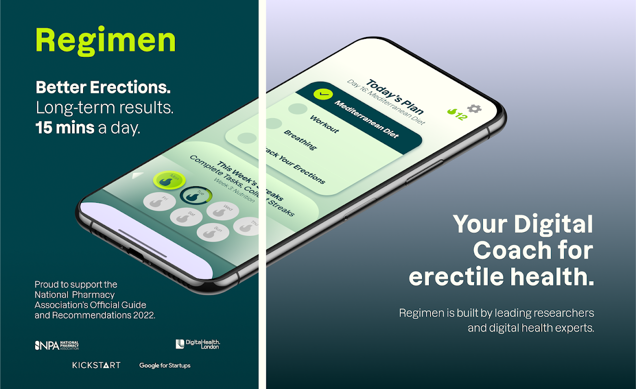 Regimen عضو تناسل کے مسائل (یا طبی لحاظ سے: عضو تناسل کی خرابی) کے لیے ایک ڈیجیٹل تھراپی ہے، جسے آپ جیسے مردوں کے لیے دنیا بھر کے کچھ سرکردہ ڈاکٹروں اور محققین نے تیار کیا ہے۔ اس کی بانی میکس نے کی تھی، جو ایک سابق مریض تھا جو اسی طرح کے پروگرام کے ذریعے اپنے عضو تناسل کے مسائل پر قابو پانے میں کامیاب تھا۔ Regimen کا مشن ہے کہ وہ ہر ایک کو بااختیار بنائے کہ وہ اپنے عضو تناسل کی دیکھ بھال مؤثر طریقے سے اور سستی کرے۔