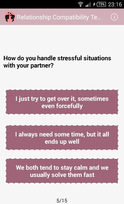 Wondering if you and your boyfriend or girlfriend are compatible? Then you should try this short Relationship Compatibility test for couples. You will have to choose between different questions, for example how often do you see each-other, how easily do you decide on what to do and where to go, how well do you handle stress and so on, and will get your compatibility score and a short explanation.