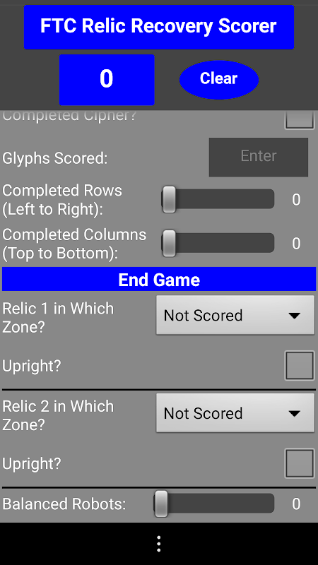 This is a scoring app used to score the 2017-2018 FTC game Relic Recovery. The app can score an entire alliance or just one robot.