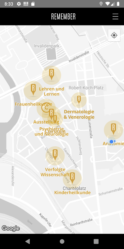 Erfahren Sie auf besondere Weise Aspekte der Geschichte der Berliner Charité während der NS-Zeit. Die REMEMBER-App begleitet Sie auf eine Reise über den Charité Campus Mitte. Die App führt Sie zu sechs Gedenkskulpturen und eröffnet Ihnen künstlerische Perspektiven auf diese düstere Historie. REMEMBER setzt sich als interaktives Denkmal mit Spuren dieser Vergangenheit auseinander und verbindet sie mit der Gegenwart. Aktuelle Technologien im Kontext zeitgenössischer Kunst bringen die schweigenden Schauplätze auf dem Charité Campus Mitte zum Sprechen.