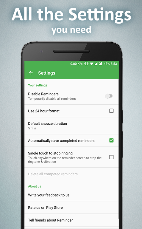 ★ Multiple custom Settings to each Reminder like ringtone, vibration, ring duration etc.