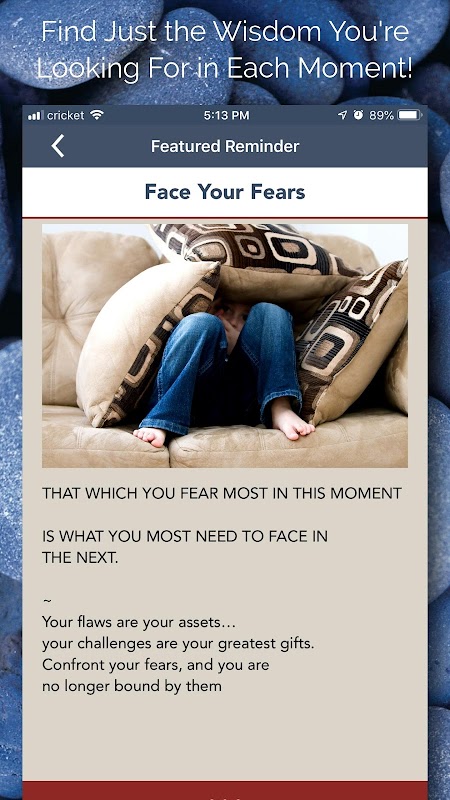 Hold a thought, question or obstacle in your mind, then tap "REMINDERS," and you will find an answer to guide you on your path.