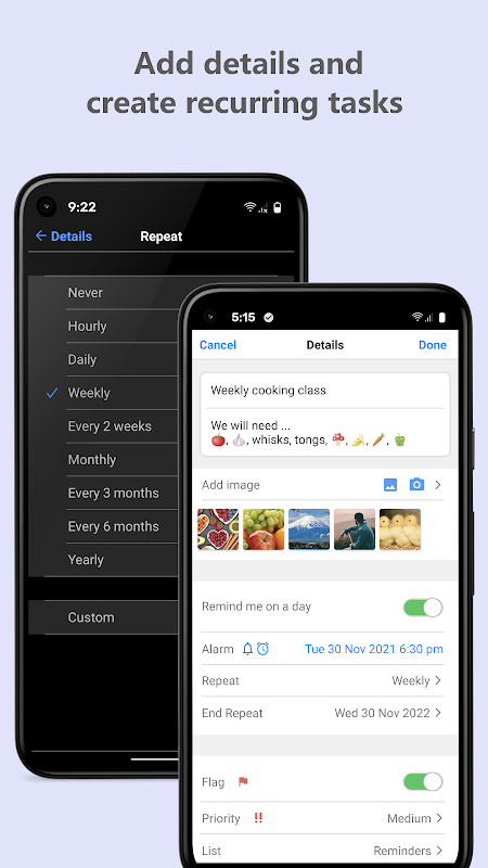 مقررہ تاریخوں اور اوقات کے ساتھ جلدی سے یاد دہانیاں بنائیں، حسب ضرورت اطلاعات اور الارم کے ساتھ مکمل کریں۔ نوٹوں، تصاویر اور ویڈیوز کے ساتھ بھرپور تفصیلات شامل کریں تاکہ یہ یقینی بنایا جا سکے کہ آپ کے پاس وہ تمام سیاق و سباق موجود ہیں جن کی آپ کو ضرورت ہے، بالکل اپنی انگلی پر۔ لچکدار بار بار آنے والی یاد دہانیاں (روزانہ، ہفتہ وار، ماہانہ، سالانہ، یا حسب ضرورت) دہرائے جانے والے کاموں کا انتظام ایک ہوا کا جھونکا بناتی ہیں۔