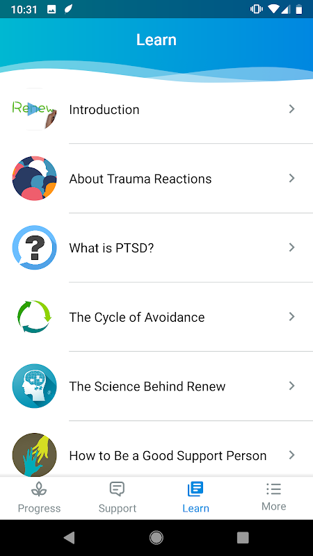 Renew Support is a companion app to Renew, which is a self-guided program to help people recover from posttraumatic stress. Renew helps people who have experienced trauma practice evidence-based cognitive behavioral therapy skills that can reduce the symptoms of posttraumatic stress and help people get back to living a full life. In Renew, points are earned for completing activities designed to decrease avoidance of safe situations, process trauma memories, and boost positive moods.