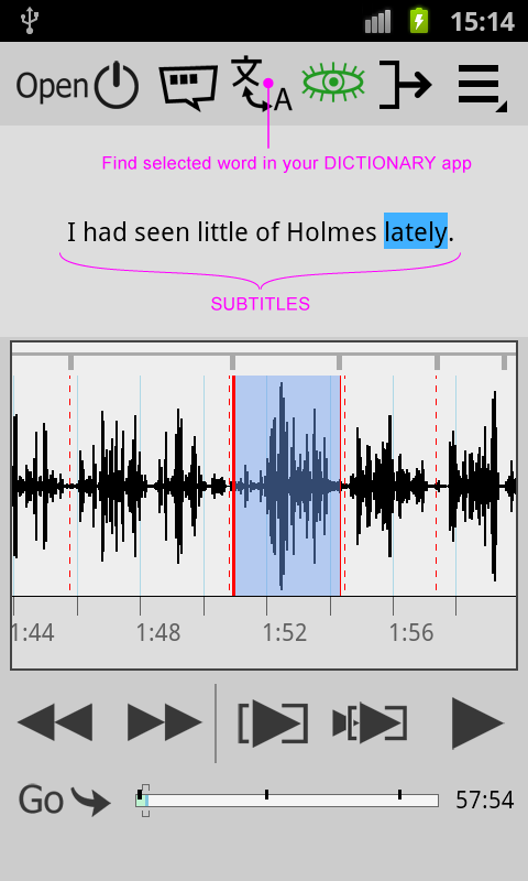 -- Shows audio as a WAVEFORM and allows you to select and listen to any fragment and even an individual word;