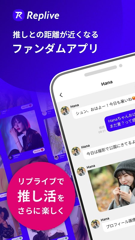 Replive ایک فینڈم ایپ ہے جو آپ کو اپنے آئیڈیل کے قریب لاتی ہے۔ اپنی روزمرہ کی زندگی کو اپنے آئیڈیل کے ساتھ بانٹیں اور اپنی آئیڈیل لائف کا مزید لطف اٹھائیں!
