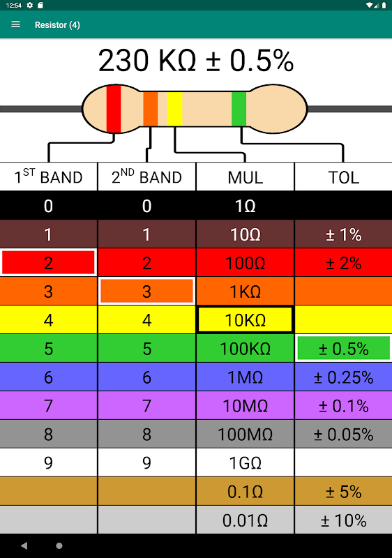 ریزسٹر کی مزاحمت کا حساب لگانے کے لئے ایپلی کیشن استعمال میں آسان رنگ کوڈ کیلکولیٹر ہے۔ ایپلی کیشن 3 ، 4 ، 5 ، اور 6 بینڈ مزاحموں کے لئے رنگین کوڈ کی حمایت کرتی ہے۔