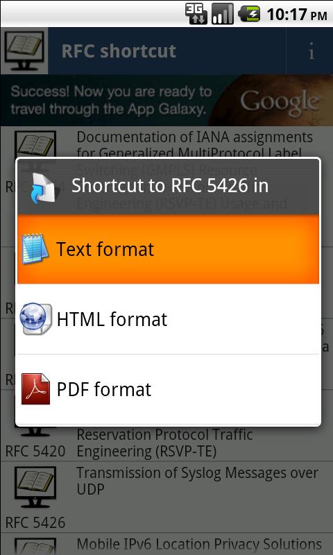 Just dial the ID of the RFC document you want and choose the format (As Text, As HTML or As PDF) in which you would like to read the document. You can also Star your favorite and mostly referred RFCs and pick it from the starred list.