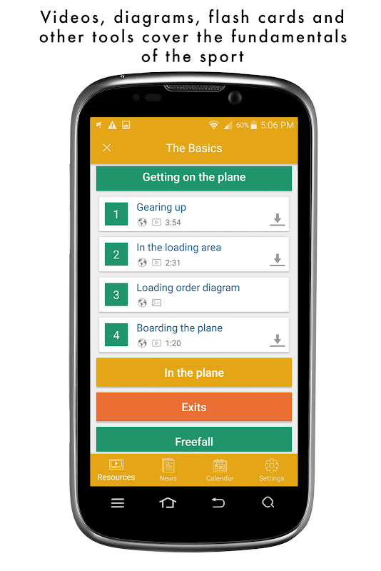 تال اسکائی ڈائیونگ 101 نئے اسکائی ڈائیور کو ویڈیو ، ڈایاگرام ، فلیش کارڈز اور کھیل کے بنیادی اصولوں کو ڈھکنے والے دیگر ٹولز کی ایک صف دیتی ہے۔ طرح طرح کی معلومات اور مشقیں آپ کی اسکائی ڈائیونگ مہارت اور علم کو ہوا اور زمین دونوں پر استوار کردیں گی۔ ہر اسکائی ڈائیونگ گنتی کو بنائیں!