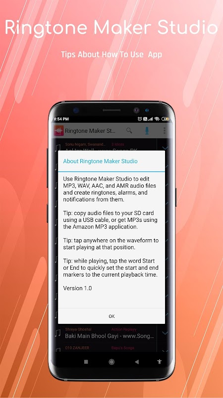 رنگ ٹون میکر اسٹوڈیو ایپ ہے "جہاں آپ اپنی خواہش کے مطابق گانوں کو اپنی مرضی کے مطابق بنائیں" رنگ ٹون ، نوٹیفیکیشن ٹون اور WAV ، AAC / MP4 ، # GPP / AMR ، MP3 فائلوں سے بھی الارم بنانے کے ل create۔
