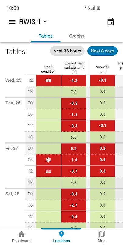 روڈ ماسٹر ڈیش بورڈ انتباہات فراہم کرتا ہے جب پھسلن والے حالات کی پیش گوئی کی جاتی ہے یا جب برف یا زیادہ سے زیادہ ہوا کے جستوں کی مقدار اگلے 24 گھنٹوں میں پہلے سے طے شدہ حد سے تجاوز کرنے کی پیش گوئی کی جاتی ہے۔ ڈیش بورڈ مزید تفصیلی معلومات بھی دکھاتا ہے جیسے روڈ کی سطح کا کم سے کم درجہ حرارت اور مقامی روڈ موسم انفارمیشن سسٹمز اور ڈومینز کے لئے سڑک کے حالات۔ گھنٹوں سڑک کے موسم کی پیش گوئی رنگ کوڈت جدولوں اور گرافوں کے استعمال میں آسانی سے پیش کی جاتی ہے۔