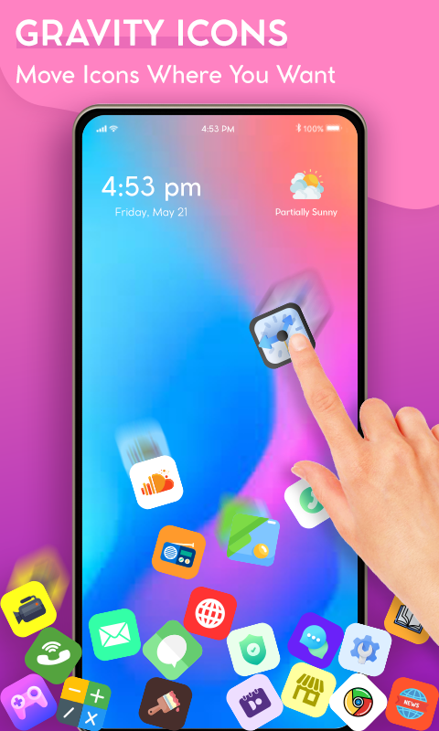 Rolling app launcher rolls the icons of mobile apps in 3D rotation with gravity force on the screen. Just rolling of app icons swaps the selected icons of apps on the screen with gravitation. Rolling fall of apps’ icons creates amazing effects like rolling stone. Roll world of rolling icons creates 3D screen magical effect. Roll world gives such rolling falls to the app icons as gravity tower uplifts or rotates the icons with gravity force on the screen to collide. Random movement of icons on the screen is quite wonderful process. Gravity launcher rolling app icons and photo icons further beautify your mobile screen. Through gestures you can give extra roll to any icon you want for 3D rotation.