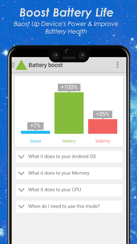 Stability Boost setting kills all the poorly performing apps, functions and settings to improve overall functionality, performance and stability of your device to it's prime so that whenever you use your device it feels like new every time.