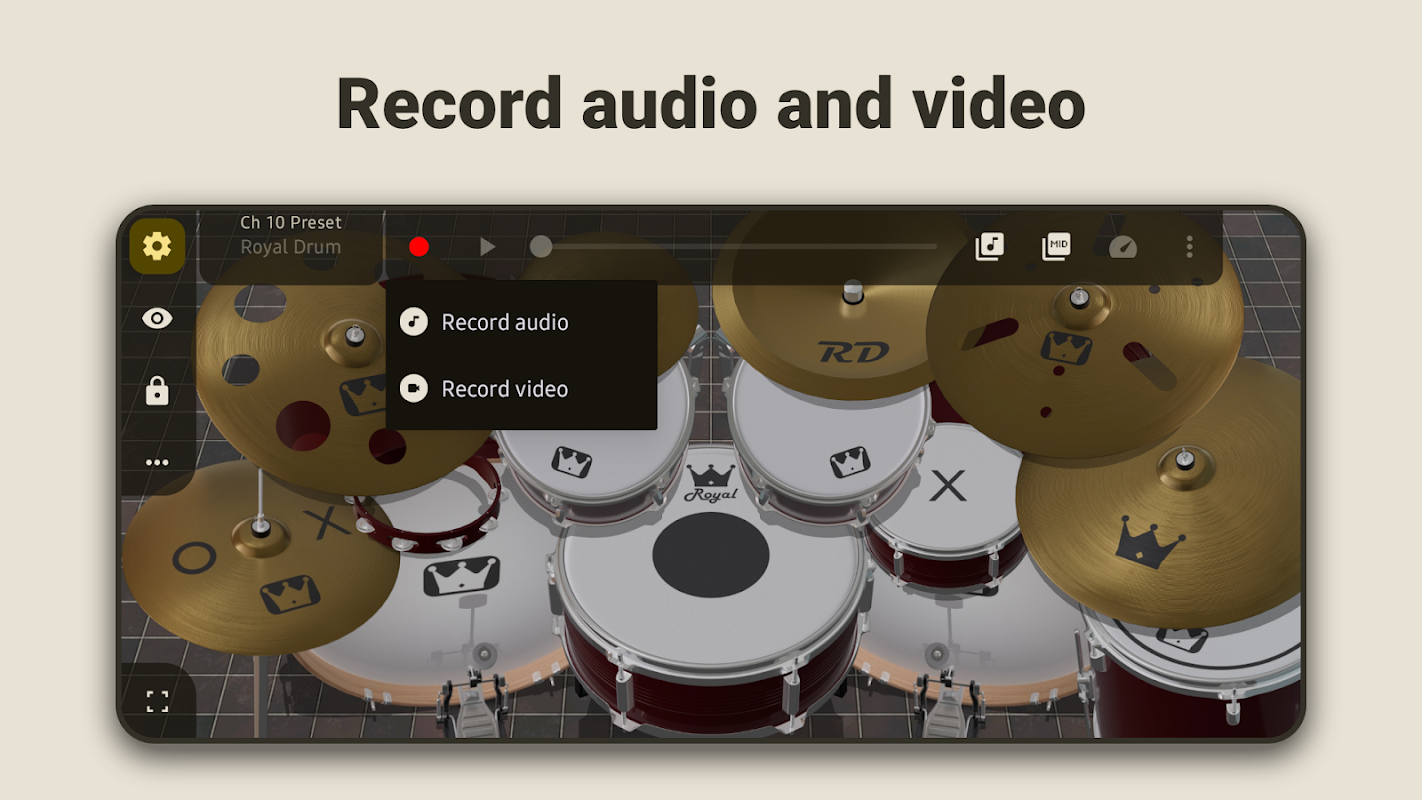 آسانی کے ساتھ اپنے سیٹ اپ کو حسب ضرورت بنائیں۔ اپنی بہترین کٹ تیار کرنے کے لیے انفرادی ڈرم دکھائیں یا چھپائیں، اور درست آواز کے ڈیزائن کے لیے ہر ڈرم کے لیے والیوم اور پین کنٹرول کو موافقت دیں۔ آڈیو اور ویڈیو ریکارڈنگ کے ساتھ اپنے شاہکار کو کیپچر کریں، جو آپ کے کام کو شیئر کرنے یا بہتر کرنے کے لیے بہترین ہے۔