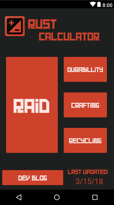Provides a Raid Calculator (in terms of Sulfur and Charcoal), Has Durability, Crafting, and Recycling values. Provides a quick access to the Rust Dev blog and can direct users to more detailed and complete information about Rust.
