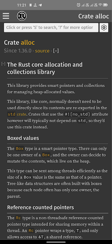اس ایپ میں رسٹ ایس ٹی ڈی اور کور کی تمام دستاویزات شامل ہیں۔ یہ ایک آف لائن ایپ ہے۔