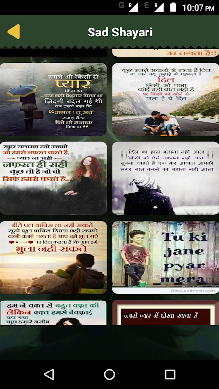 Sad Shayari is the best collection of hindi and Urdu Dard shayari. You can share your sad feelings by this appliction. Share your feelings with your friends and downloads and upload in all social media.