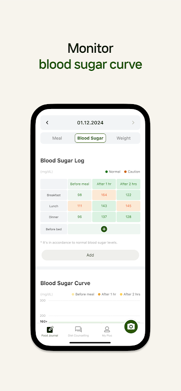 - آپ کھانے سے پہلے، 1 گھنٹہ اور کھانے کے 2 گھنٹے بعد بلڈ شوگر کی سطح کو لاگ ان کر سکتے ہیں۔