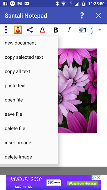 اوپری بائیں کونے (3 عمودی نقطوں) پر عام بٹن دبانے سے ، متعدد اختیارات جیسے 'نئی دستاویز' ، 'منتخب متن کی کاپی کریں' ، 'تمام متن کی کاپی کریں' ، 'پیسٹ متن' اور 'فائل کو حذف کریں' ، 'تصویر داخل کریں 'اور' ڈیلیٹ امیج '۔ اسی اختیارات کو منتخب کرکے کاپی اور پیسٹ کریں۔
