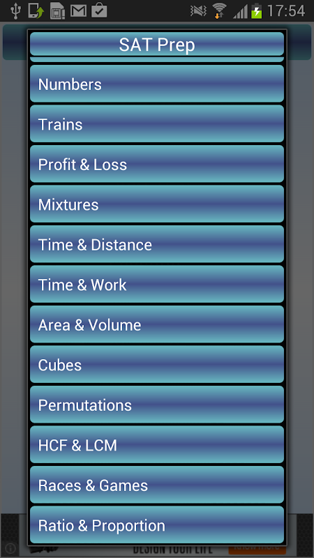 SAT Prep is a collection of 600+ quantitative aptitude questions and word problems frequently asked in competitive examinations, entrance test and placement papers. It is designed as a preparation tool for job aspirants and those waiting to crack CAT, XAT, MAT, GRE, GMAT, SAT, NTSE and various bank exams. People with an inclination towards mathematics can use this app to sharpen their IQ, test their aptitude skills and enrich their knowledge.