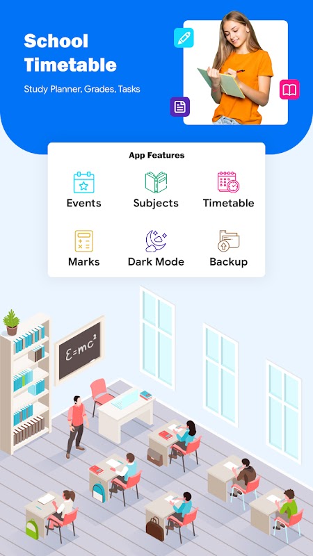 اسکول کا ٹائم ٹیبل جو آپ کو اپنے تمام نمبر ، ٹائم ٹیبل ، ایونٹس ، کلاس نوٹس اور ہوم ورک کو منظم کرنے دیتا ہے۔