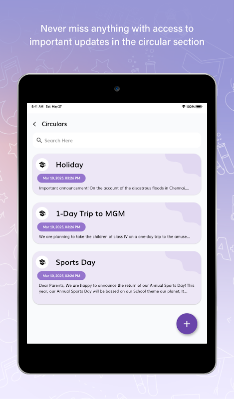 - نوٹس بورڈ سیکشن میں، اساتذہ اسکول سے متعلق تمام اہم اپ ڈیٹس بھیج سکتے ہیں، جیسے کہ چھٹیاں، تقریبات، امتحانات، اور اسکول کی تمام کلاسوں کے لیے بہت کچھ۔