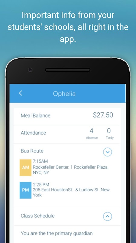 - پڑھنے میں آسان ان باکس جو اسکول کے سبھی اطلاعات پر قبضہ کرتا ہے ، اور اب دو طرفہ اساتذہ والدین کے طلباء کے پیغامات (اگر اسکول یا ضلع کے ذریعہ قابل بنائے گئے ہیں)
