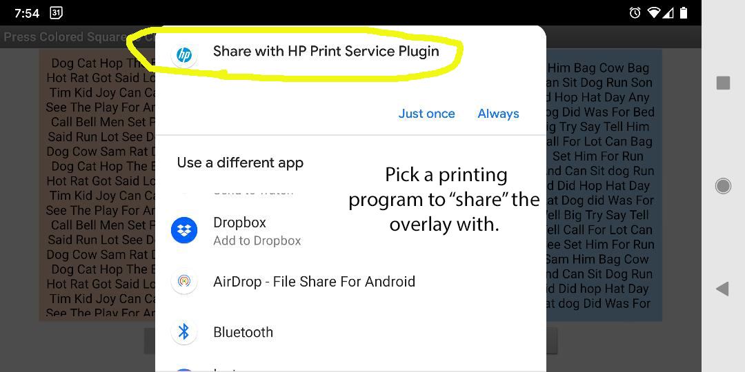 To use the program, press the colored squares to compare colors, when you obtain a color that you want to print press the "share" button. You need to press the share button twice. Once to create the image and the next to "share" it.