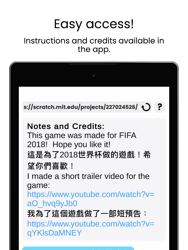 ScratchGO ایک ایسی ایپ ہے جو Scratch اور TurboWarp پر بناتی ہے تاکہ آپ اپنے فون پر اپنی پسندیدہ سکریچ گیمز کھیلیں! ہر کلید آپ کے گیم کے کنٹرولز سے ملنے کے لیے حسب ضرورت ہے اور ماؤس کنٹرول اب بھی معمول کے مطابق کام کرتے ہیں!