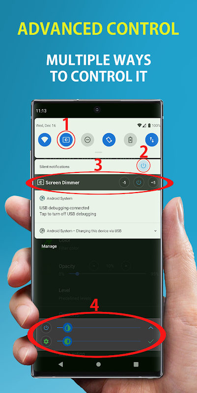 اسکرین ڈیمر پلس آپ کی دھندلاپن اور چمک کے ساتھ اپنی اسکرین پر رنگین فلٹر مرتب کرنے کی اجازت دیتا ہے جو آپ کی ضروریات کے مطابق ہے۔ یہ آپ کے آلے کو اندھیرے میں یا رات کے وقت آپ کے وژن کو نقصان پہنچائے بغیر استعمال کرنے کے لئے موزوں ہے۔
