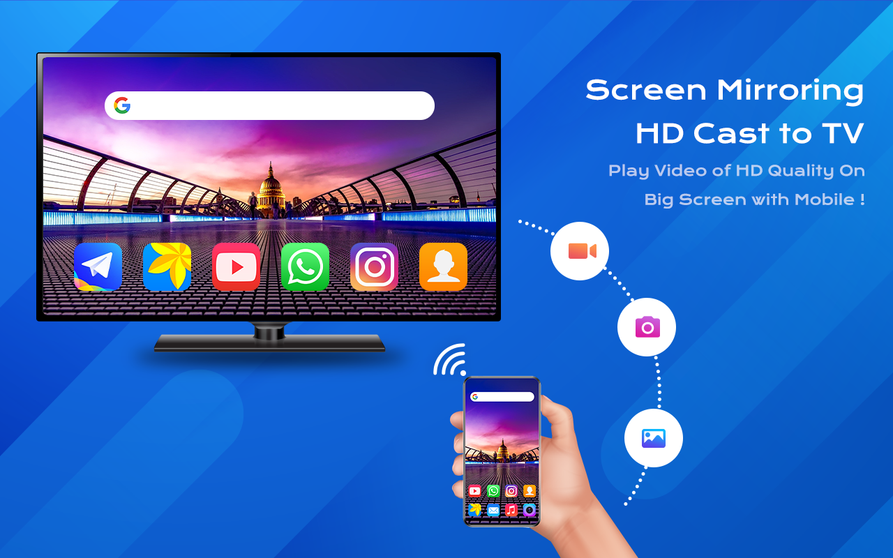 Screen Mirroring is a tool, which allows you to mirror your smartphone on TV screen with high quality. You can easily access all of your games, photos, videos and other application on a big screen using Mirror Screen to TV App.