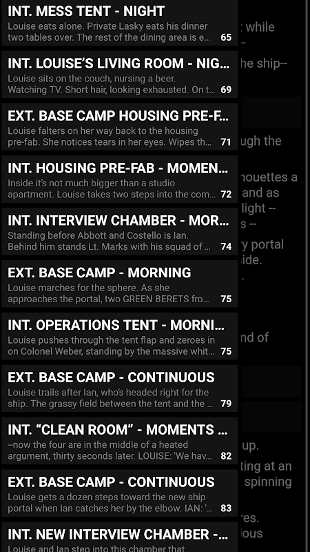 - Scene navigation: swipe from the left edge of the screen to see a list of all the scenes in the script. Tap one to navigate directly to that scene.