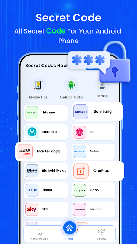 سیکرٹ کوڈ ٹرک اور سائفرز کو موبائل ٹپس ملیں گی جیسے انٹرنیٹ کی رفتار کے اشارے شامل کرنا، مالک کی معلومات، پہلی چیزیں، میموری کا انتظام کرنا، ڈیوائس کی کارکردگی، اینڈرائیڈ کے OTG کے استعمال کو تیز کرنا، اور بہت کچھ۔ آپ آسانی سے اپنے آلے کی معلومات حاصل کر سکتے ہیں، جیسے کہ ڈیوائس کا نام، ڈیوائس ID، ماڈل کا نام، SDK، قسم، میزبان، اور بہت کچھ۔ آپ کے ساتھ خفیہ کوڈ ٹرک اور سائفرز مختلف ملک کے کوڈ حاصل کر سکتے ہیں۔