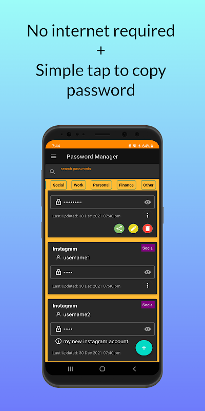 سیکیور پاس ورڈ مینیجر ایک آف لائن ایپ ہے جو آپ کو اپنے فون پر اپنے پاس ورڈز کو مقامی ڈیٹا بیس میں محفوظ کرنے میں مدد کرے گی، جہاں آپ کے پاس ورڈز کو انکرپٹ کیا گیا ہے۔