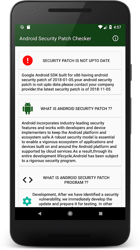 اس ایپلیکیشن سے آپ کو معلوم ہوگا کہ آپ کا سیکیورٹی پیچ تازہ ترین ہے یا نہیں اس سے آپ کو تازہ ترین android حفاظتی پیچ چیک کرنے میں مدد ملے گی۔ ہم ہر ماہ کی گوگل کی تازہ ترین سیکیورٹی پیچ اپ ڈیٹ سے براہ راست پیچ چیک کر رہے ہیں۔ گوگل گوگل جاری کررہا ہے سیکیورٹی پیچ ہر مہینے اور ہم ان کی ڈائرکٹری سے براہ راست پیچ کی تفصیلات لے رہے ہیں اور اس بنا پر چیکر آپ کو بتائے گا۔!