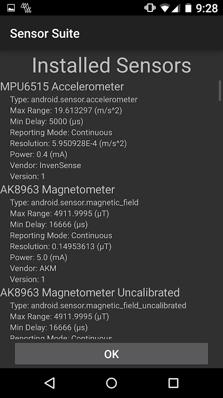 Sensor Suite provides high precision data acquisition, graphing, and export for all hardware and software sensors available on your Android device. Great for experiments, demonstrations, and learning about your device's sensors.