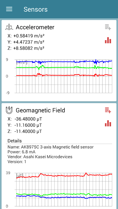 - میگنیٹومیٹر، محیطی مقناطیسی فیلڈ کی قدروں کی طاقت (مائیکرو ٹیسلا، µT)