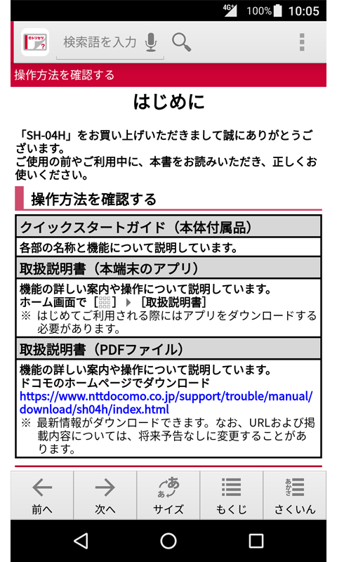 取扱説明書を閲覧できるだけでなく、フリーワード検索や表示中のページから設定画面やアプリを直接起動できるなど、SH-04Hをより便利にお使いいただけます。