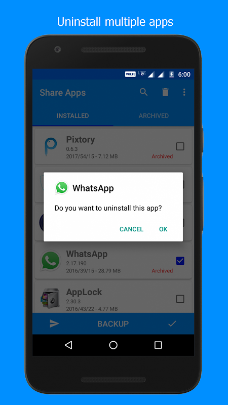 > Manage your archived apps (apks) : Share, remove or move backed up apks.