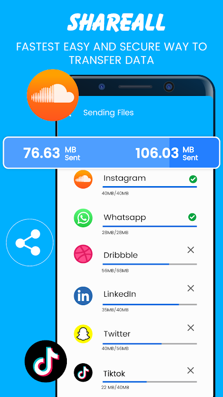 فاسٹ شیئرنگ ایپ میں خوش آمدید۔ انٹرنیٹ کے بغیر آف لائن رہتے ہوئے فائلز، موویز، ویڈیوز، ایپس، تصاویر دوسرے اینڈرائیڈ فونز کے ساتھ شیئر کریں۔ ہماری استعمال میں آسان ٹرانسفر فائل اور شیئرنگ ایپ کے ذریعے کہیں بھی بھیجیں اور سیکنڈوں میں ہر قسم کی فائلیں وصول کریں۔ تیز فائل شیئرنگ اور زیادہ سے زیادہ رفتار سے لامحدود بھیجنا۔ شیئر صارفین کو ایک ساتھ متعدد فائلیں بھیجنے کی اجازت دیتا ہے۔ WIFI اور 4G/5G ڈیٹا کے استعمال کے بغیر کسی بھی قسم کی فائل کو ایک ڈیوائس سے دوسرے ڈیوائس میں منتقل کریں۔