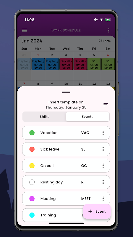 ذاتی شفٹ ٹیمپلیٹس بنائیں (جلد، دیر، رات، دن کی چھٹی وغیرہ) اور انہیں سیکنڈوں میں اپنے کیلنڈر میں شامل کریں۔ صاف ستھرا، صارف دوست انٹرفیس آپ کو اپنے Shift Work Calendar اور اپائنٹمنٹس کو ہر وقت منظم رکھنے میں مدد کرتا ہے۔