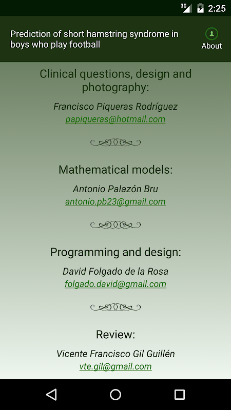 This Mobile App is a medical calculator which indicates the probability that a boy, aged from 10 to 16 both inclusive and who plays football, of having Short Hamstring Syndrome either grade I or II (straight leg raise test less than 70º and/or more than 15º in the passive knee extension test) and in the case of only grade II (straight leg raise test less than 60º and/or passive knee extension test greater or equal than 35º).