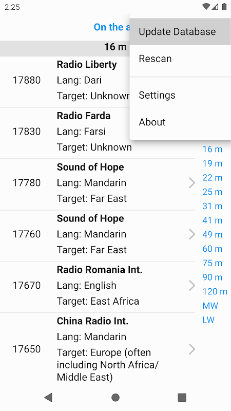ایپ شارٹ ویو ریڈیو براڈکاسٹنگ کا شیڈول دکھاتی ہے۔ EiBi ڈیٹا بیس سے لی گئی معلومات۔ جب آپ ایپلیکیشن چلاتے ہیں، تو آپ کو ریڈیو اسٹیشنوں کی فہرست نظر آئے گی، جو اس وقت دنیا بھر میں نشر ہو رہے ہیں۔ مینو میں اسکیننگ کے وقت کو اپ ڈیٹ کرنے کے لیے، "دوبارہ اسکین کریں" پر کلک کریں۔ تمام منتخب ریڈیو فریکوئنسی کو خاص طور پر دیکھنے کے لیے، دائیں بٹن کا استعمال کریں۔ جب آپ پہلی بار ایپ لانچ کرتے ہیں، یا شیڈول ڈیٹا بیس کو اپ ڈیٹ کرنے کے لیے، "ڈیٹا بیس کو اپ ڈیٹ کریں" کو منتخب کریں۔