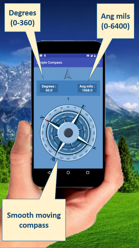 Keep your phone parallel to the ground and turned toward the point that you want to define. Compass will display on-screen degrees and ang mils.