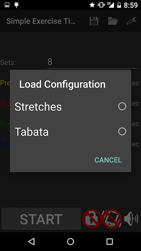 Save and load any number of workout configurations. The app comes with the standard Tabata configuration preloaded (8 sets of alternating 20 seconds of work and 10 seconds of rest). It also comes with a configuration for stretching.
